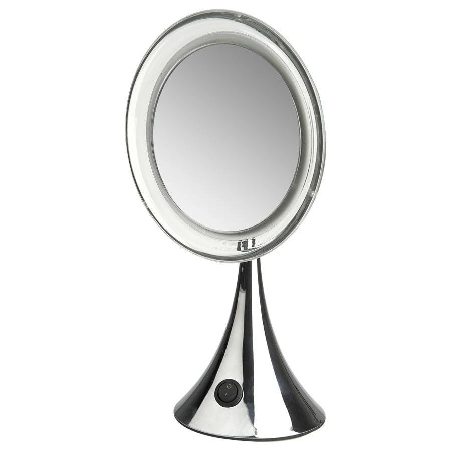 De LED make-up spiegel met 5x vergrotende werking is voorzien van LED verlichting rondom. Op de poot van de spiegel is een aan- en uitschakelaar verwerkt. De spiegel werkt op 3 AAA-batterijen, deze worden meegeleverd.