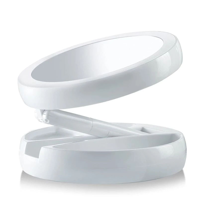 Een extreem praktische spiegel die uw make-up routine gemakkelijker maakt, ongeacht waar u bent! De spiegel is gemakkelijk op te vouwen en is daarom gemakkelijk met u mee te nemen of gewoon in een lade op te bergen. De spiegel is gemaakt van wit plastic en heeft een elegante kleine voet waarop je borstels, lippenstift of sieraden kunt plaatsen.
